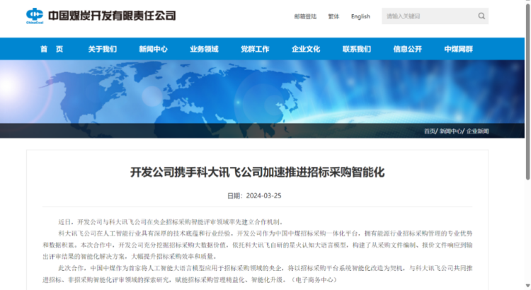 近日,中国煤炭开发有限责任公司邀请讯飞星火大模型入驻,让“AI评标师”助力企业内部提质增效,将基于星火大模型,结合中煤开发公司招投标文件、评标报告等历史数据,通过学习、训练,构建能源行业评标大模型底座,并通过低侵入集成方式,快速完成与现有招标采购系统的融合,实现智能辅助寻源文件编制、招标业务智能辅助评标、非招标业务智能辅助评标、议价智能辅助评审等功能,推动招采业务全流程智能化升级。