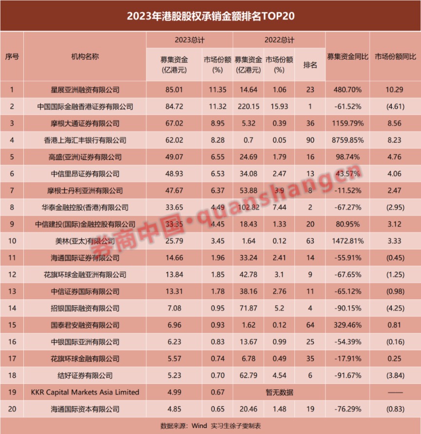 值得一提的是,星展亚洲融资有限公司的市场份额由去年的1.06%提升到11.35%,主要得益于拿下了3个配股项目,平均每个承销金额高达46.46亿港元。