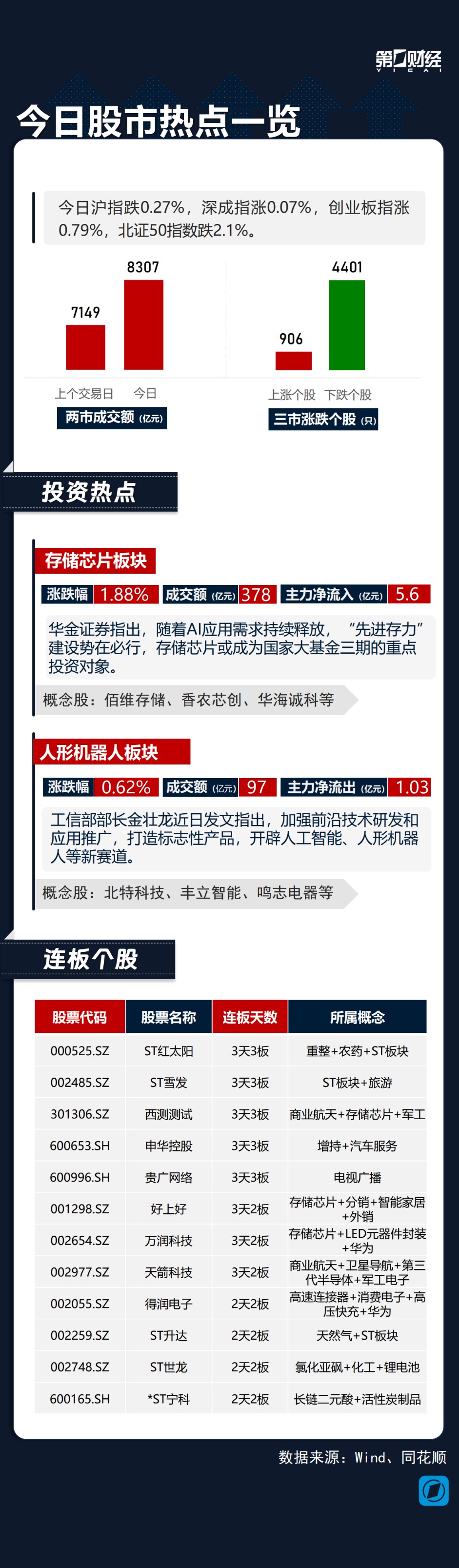 今日三大指数收盘涨跌不一,沪指跌0.27%,深成指涨0.07%,创业板指涨0.79%;北证50指数跌2.1%。